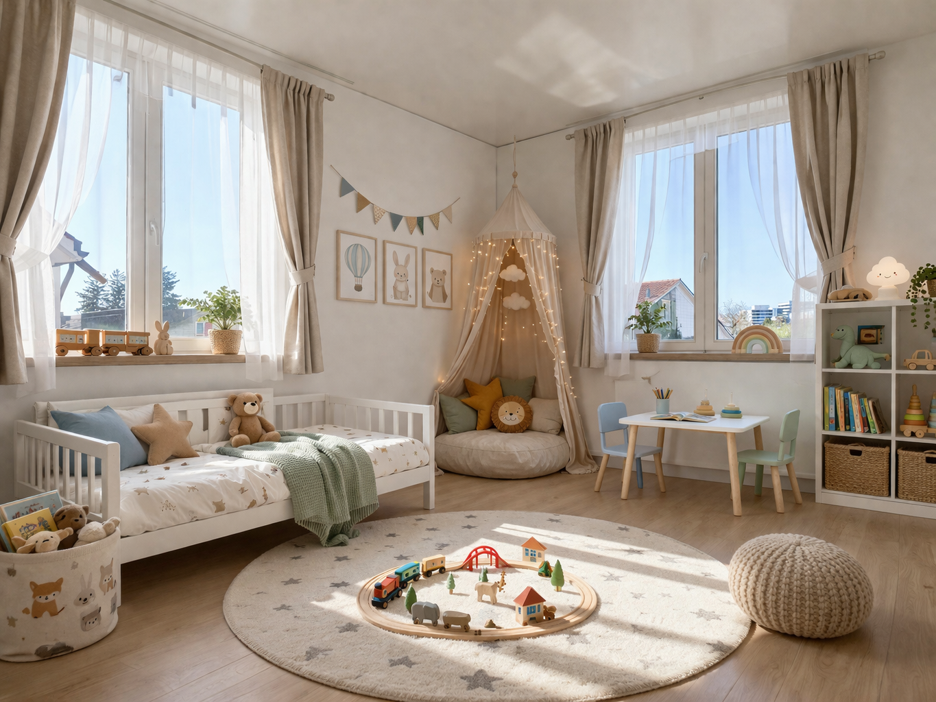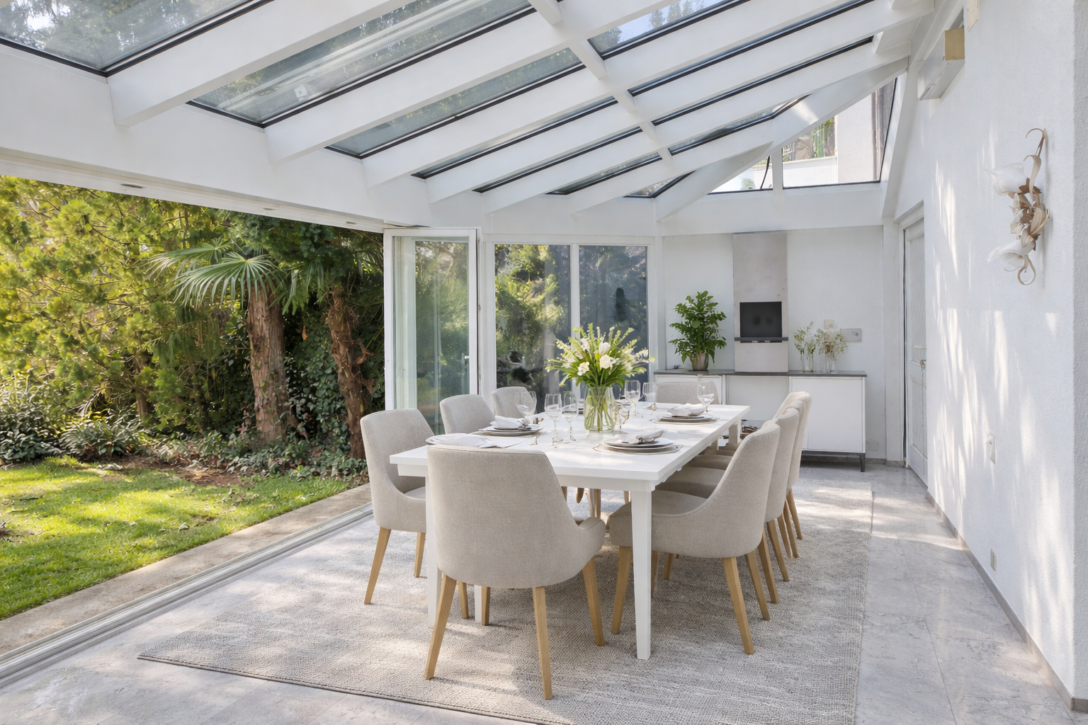 Ein besonderes Highlight ist der grosszügige Wintergarten mit Beschattung, der ganzjährig genutzt werden kann und direkten Zugang zum Garten bietet – perfekt für fliessende Übergänge zwischen Innen- und Aussenbereich.